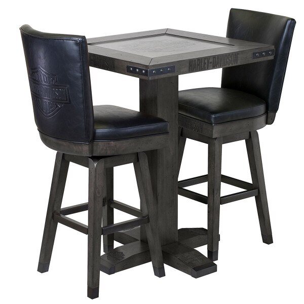 Distressed solid pine pub table and bar stool with metal accents are available in two finishes, Industrial Grey and Rawhide Brown. Tabletop features embossed Bar & Shield under protective glass surface and laser engraved H-D logos. Base also includes embossed Bar & Shield logos. Swivel stool features laser engraved Harley-Davidson® on seat frame and embossed Bar & Shield on leatherette backrest. Easy assembly required.