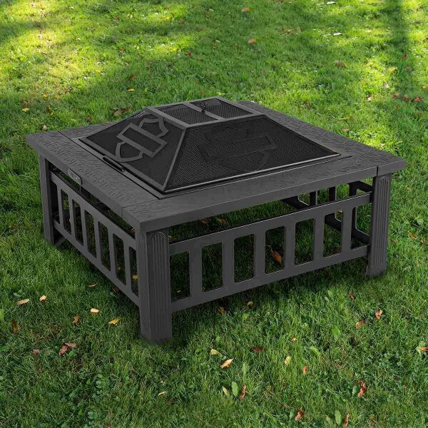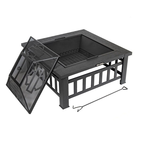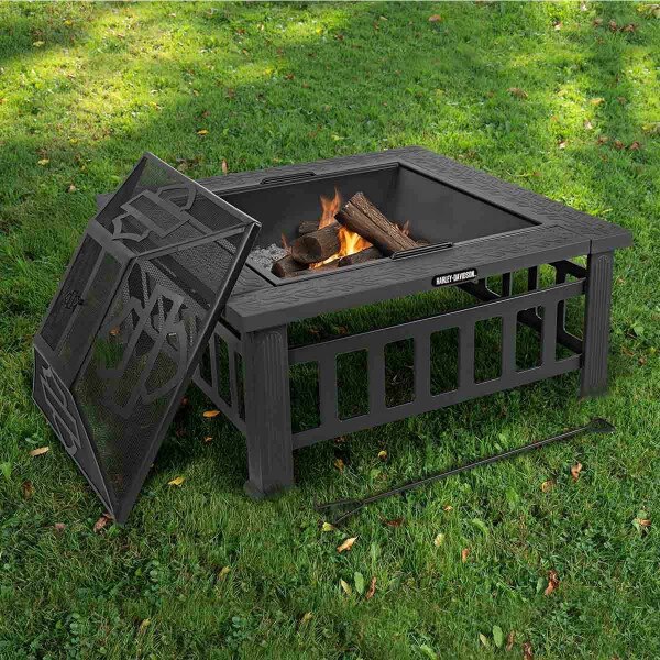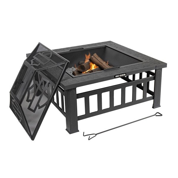 Custom-tooled fire pit features embossed H-D tire tread pattern and Open Bar & Shield cut outs on handle and screen. Harley-Davidson medallion on edge. Outdoor use only. Easy assembly required.